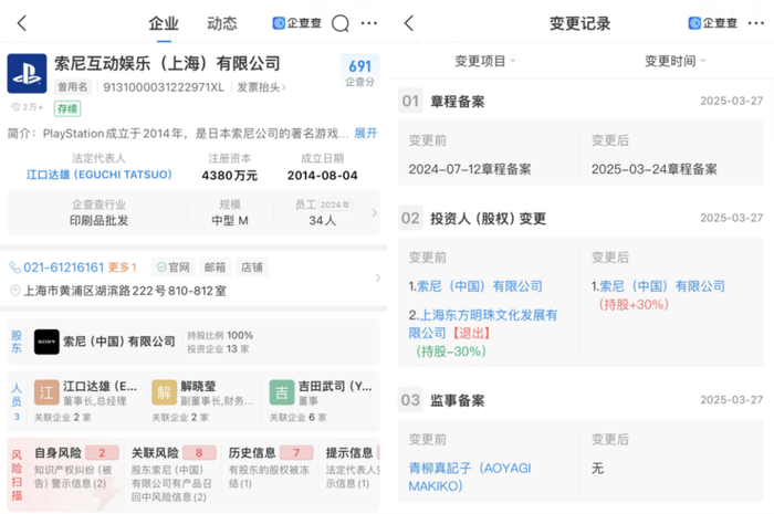 为支撑中国市场的IP战略,索尼完成了关键的架构调整。企查查显示,2025年3月27日,索尼互动娱乐(上海)有限公司(以下简称“索尼互动娱乐”)发生股权变更,上海东方明珠文化发展有限公司退出,其持有的30%股份由索尼(中国)有限公司(以下简称“索尼中国”)接手。至此,索尼互动娱乐成为索尼中国的全资子公司,消除了股权障碍,有利于内部决策与资源调配的统一性。