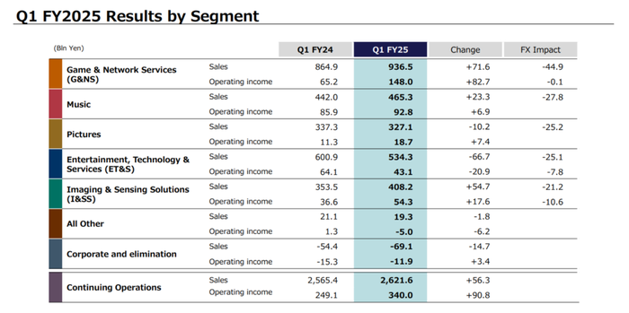 2025年Q2,索尼集团整体表现稳健,销售收入达26216亿日元,同比增长2%,净利润2590亿日元,同比大增23%。在各项业务中,游戏与网络服务(G&NS)、音乐、影视、影像与传感解决方案(I&SS)成为主要增长引擎。