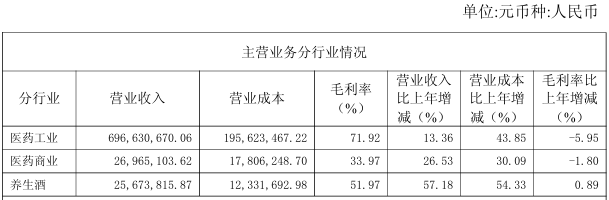 报告显示,公司营业收入同比增加18.14%,主要是因为医药工业收入达6.97亿元,较上年同期增加13.36%;另外养生酒营业收入也长势喜人,为0.26亿元,虽占总营业收入比例较低,但相较上年同期增长高达57.18%。