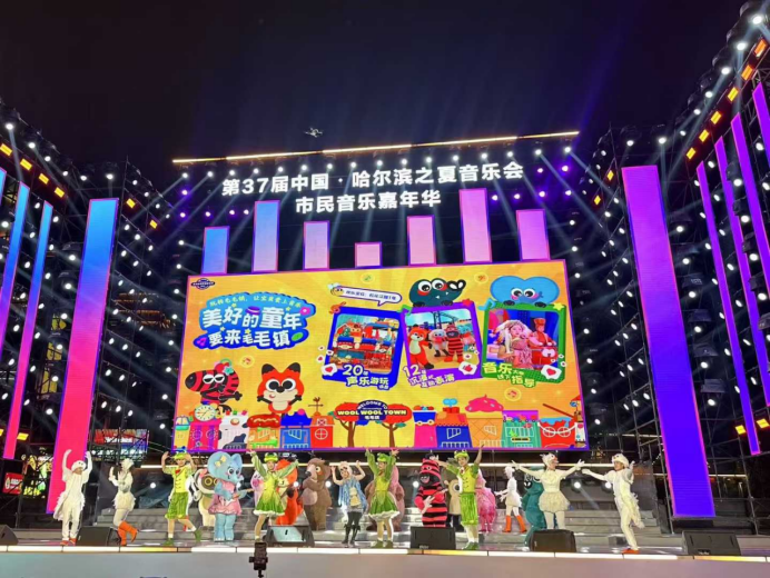 巡游结束后,毛毛镇还在哈尔滨之夏舞台,上演了一场精彩的演出,毛毛镇音乐主题乐园那得人偶表演,都是有国际演艺团队编创,表现形式与音乐氛围也非常优质,现场小朋友都在舞台下跟着节奏唱跳起来,很多成年游客也随着节奏轻轻摇摆,乐在其中。