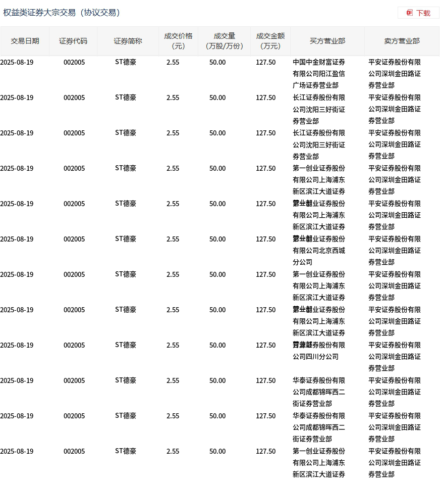 8月19日,ST德豪大宗交易成交600万股,成交额1530万元,占当日总成交额的29.34%,成交价2.55元,较市场收盘价2.68元折价4.85%。