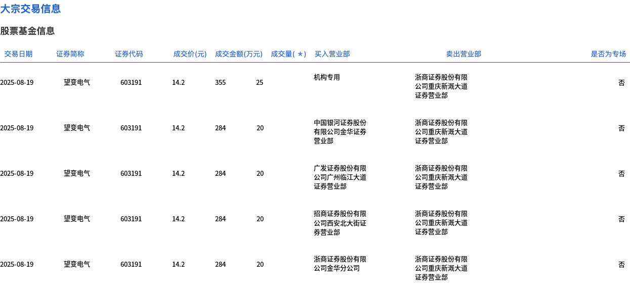8月19日,望变电气大宗交易成交225万股,成交额3195万元,占当日总成交额的13.53%,成交价14.2元,较市场收盘价15.74元折价9.78%。