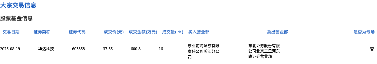 8月19日,华达科技大宗交易成交16万股,成交额600.8万元,占当日总成交额的6.72%,成交价37.55元,较市场收盘价38.72元折价3.02%。