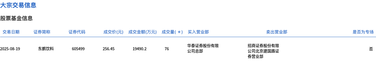 8月19日,东鹏饮料大宗交易成交76万股,成交额1.95亿元,占当日总成交额的14.74%,成交价256.45元,较市场收盘价296.65元折价13.55%。