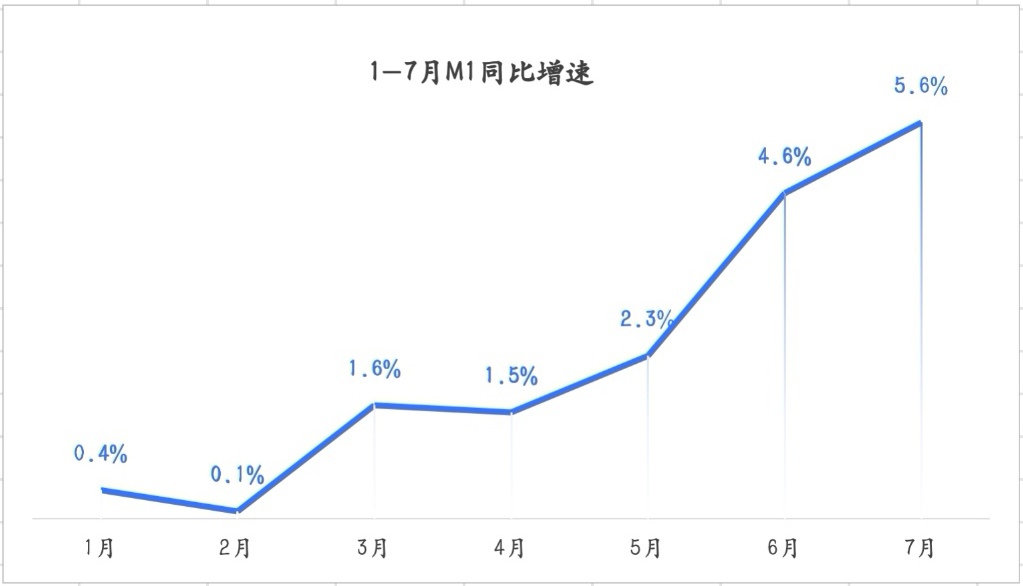 林英奇指出,7月份金融数据最大的亮点是狭义货币(M1)同比增长5.6%,增速比上月上行1个百分点左右,创29个月新高。有分析认为M1的大幅改善主要来自去年监管清理手工补息造成的低基数效应,但林英奇认为原因不止于此。一方面,监管清理手工补息主要发生在去年4、5月,之后低基数效应大幅下降,另一方面, 新的M1口径中加入了居民活期存款,7月M1的回升很大程度来自居民活期存款上升。