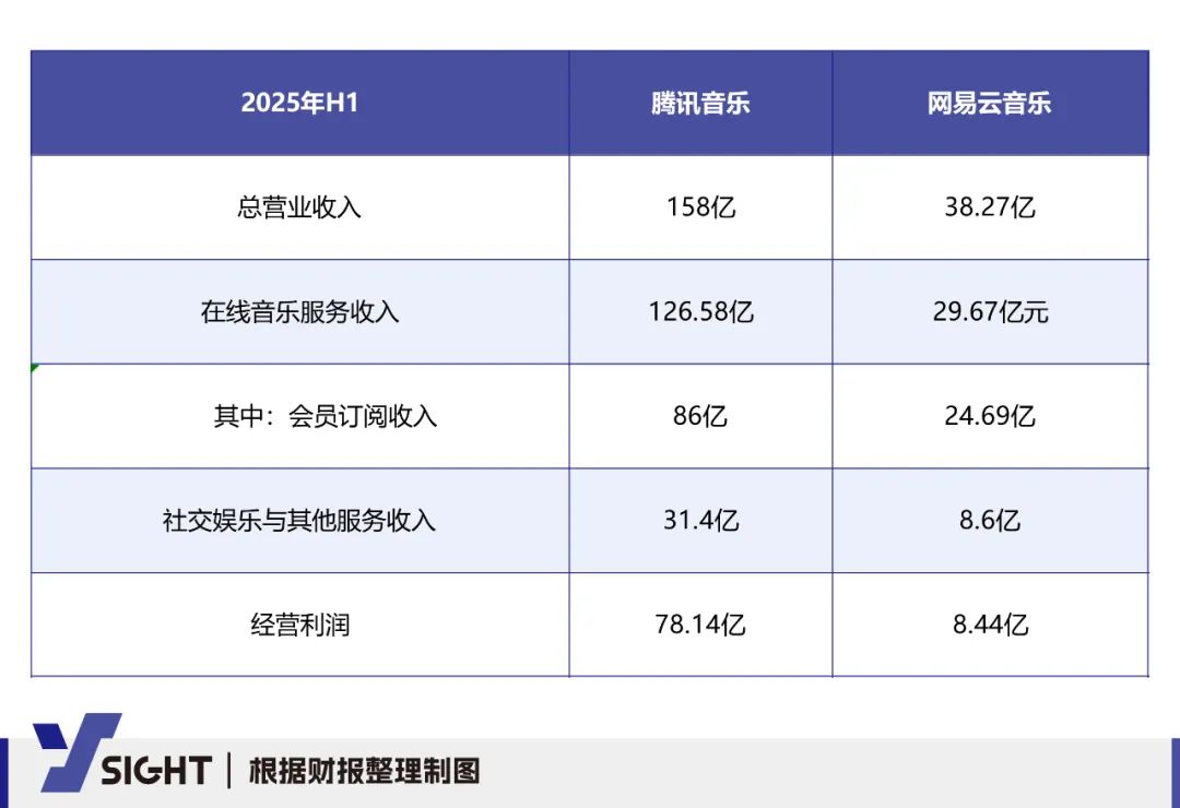 截止到2025年上半年,网易云音乐的在线音乐服务收入为29.67亿元,其中会员订阅收入为24.69亿元;同期腾讯音乐的在线音乐收入为126.38亿元,订阅收入为86亿元。