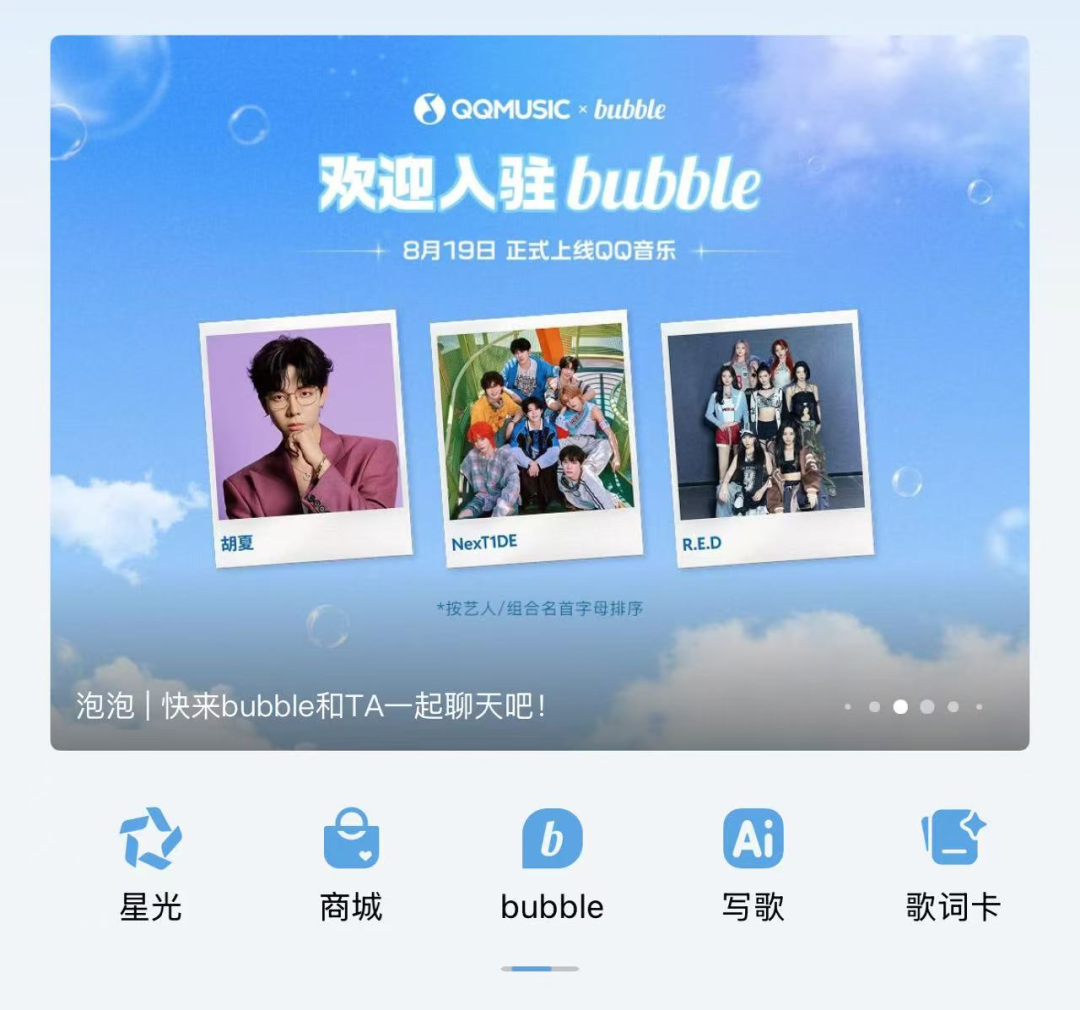 腾讯音乐在最新财报中的一大亮点就是今年新引进的韩流追星利器“bubble”,可以让粉丝与艺人进行亲密互动,最大的卖点是一对一的“付费聊天”,可以接收艺人发送的聊天信息,还可以回复。