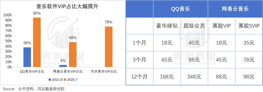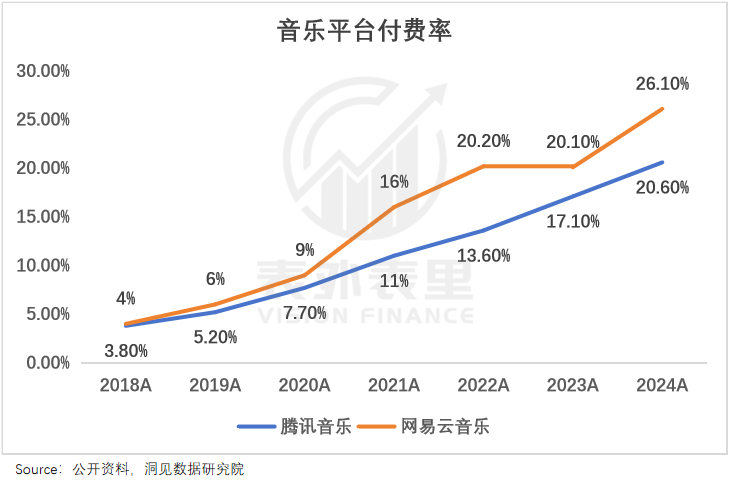 这样一来,“为内容付费”的用户心智,逐渐被合力塑造起来。如下图,TME和网易云的付费率在过去几年间稳步提升,平台盈利模型得到初步修复。