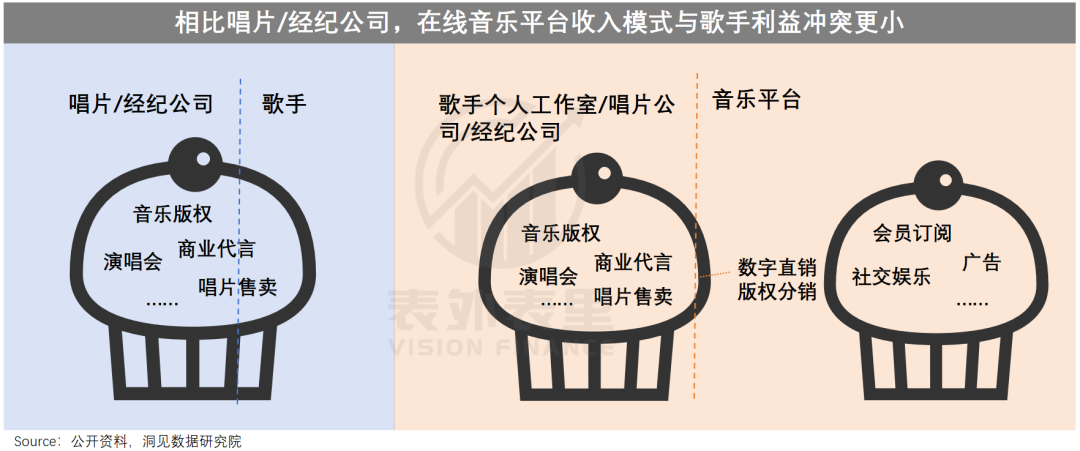 以往唱片公司、经济公司为回收“造星”成本,会从歌手音乐版税、商业代言等收入中大笔抽成,而音乐平台有会员、广告、社交娱乐收入,能腾挪出更大让利空间。