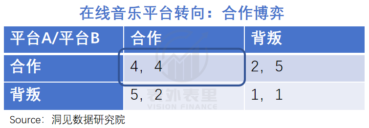为了方便理解平台间的博弈关系,我们假设有在线音乐平台A和B,双方共享版权写作“合作”、独占版权为“背叛”,可以分析出不同选择下的收益情况: