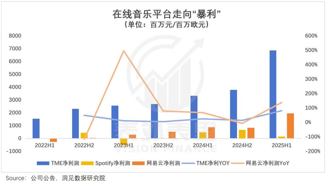 平台业绩随之起飞,TME最新一季营收同比增长17.9%,净利润拉升33%至26.4亿元;网易云上半年运营利润达9.05亿元,同比大增35%。