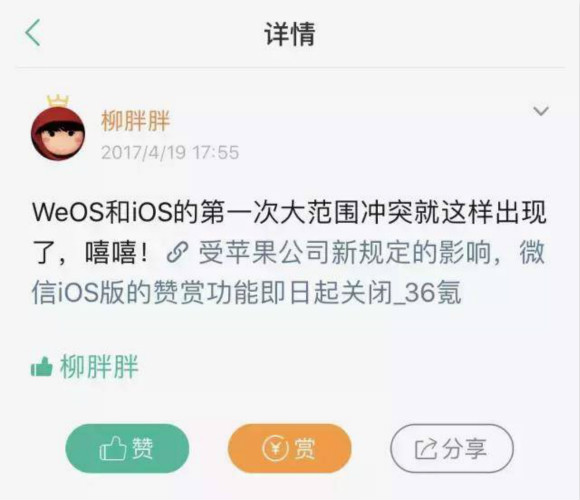 4月19日的时候,微信主动下线了iOS版微信公众号的打赏功能,当时各方讨论很多,我在我的小密圈里提到的一个看法是:这是微信OS和iOS的第一次冲突。