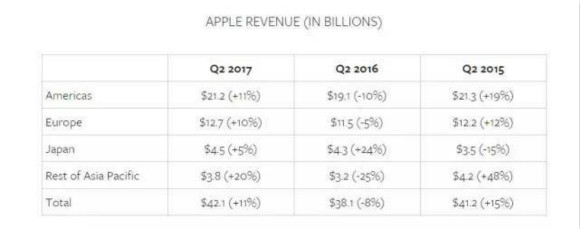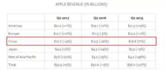 下面还是苹果的营收情况,不过这一次,我们增加了中国大陆市场的数据: