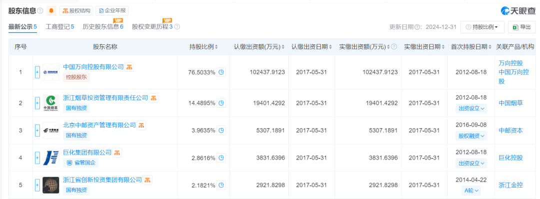 天眼查信息显示,万向信托2012年8月成立,总部位于浙江省杭州市,注册资本13.39亿元。从股权结构看,该公司控股股东为中国万向控股有限公司(下称“万向控股”),持股比例76.5%,其他股东分别为浙江烟草投资管理有限责任公司、北京中邮资产管理有限公司、巨化集团有限公司、浙江省创新投资集团,持股比例分别为14.49%、3.96%、2.86%、2.19%。鲁伟鼎为公司实际控制人,持股比例67.76%。