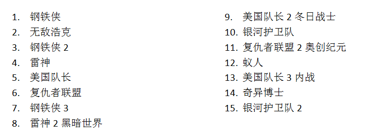 漫威每一部电影剧情的连贯性不强,但若没照顺序看,难免会错过一些好笑的吐槽梗,在这里附上正确观影顺序,美剧如神盾局特工、特工卡特、夜魔侠等等就不附上了,太多了,本鹿自己都追到放弃,就不写在这里了。。。一天一部电影,两周就追完了。