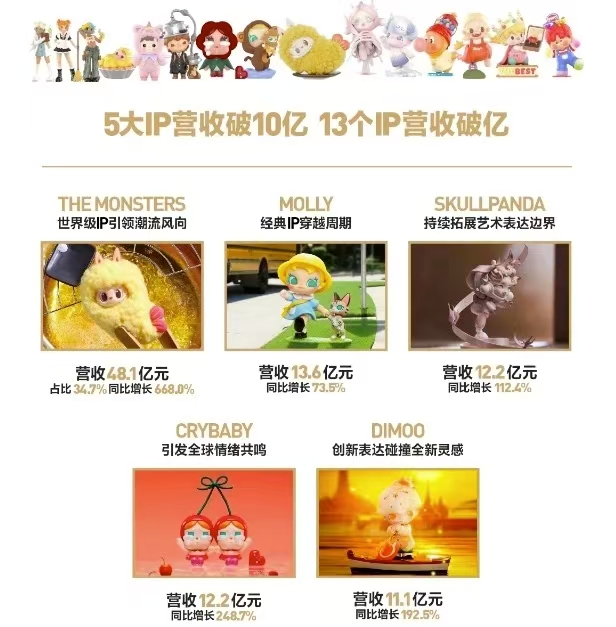 细读泡泡玛特的业绩公告,可以拆解出一些市场趋势,比如潜力IP类型、潜力产品品类、增速快的海外区域市场,以及泡泡玛特储备了哪些新IP。