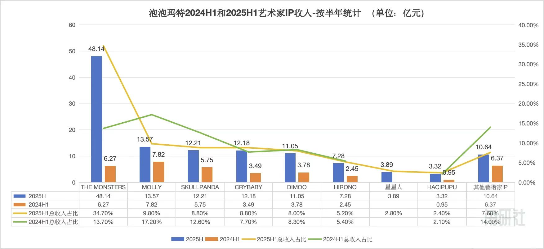 引领增长的,是艺术家IP——从去年上半年的36.88亿元,增长到了今年上半年的122.29亿元,涨幅231.6%,总收入占比也从81.0%上升到了88.1%。