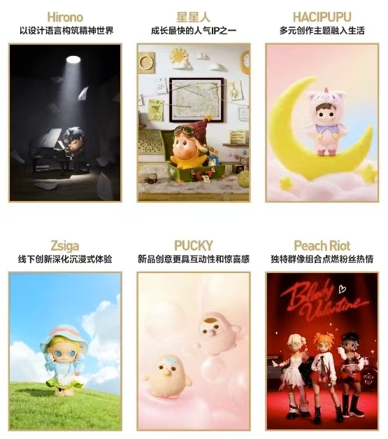 例如:搪胶毛绒搭配扎染工艺,成功打造出兼具视觉美感与触觉体验的LABUBU「前方高能」;SKULLPANDA「光织园」通过PVC注塑工艺生动刻画面部妆容,可动眼睛 更显精緻灵动;BABY MOLLY化身掌心大小的猫咪,成為粉丝的「口袋朋友」; CRYBABY「豹豹猫猫」搪胶毛绒采用长条小体积毛绒,成為穿搭的热门单品; PUCKY「豆子冒泡」系列毛绒挂件采用内置气囊,可吹出彩色泡泡;HACIPUPU「小熊软糖」系列搪胶毛绒挂件融合香甜软糖香气等。