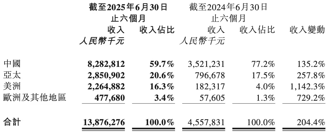 其中,中国收入从2024年上半年的人民币35.21亿元增长到2025年上半年的 82.83亿元,同比增长135.2%。
