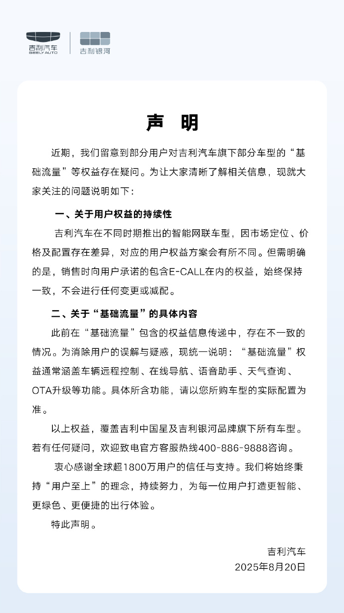 8月20日,针对用户对吉利汽车旗下部分车型“基础流量”等权益的疑问,吉利汽车发布声明指出,销售时向用户承诺的包含E-CALL在内的权益,始终保持一致,不会进行任何变更或减配。吉利汽车表示,此前在“基础流量”包含的权益信息传递中,存在不一致的情况。为消除用户的误解与疑惑,现统一说明:“基础流量”权益通常涵盖车辆远程控制、在线导航、语音助手、天气查询、OTA升级等功能。具体所含功能,请以所购车型的实际配置为准。以上权益,覆盖吉利中国星及吉利银河品牌旗下所有车型。