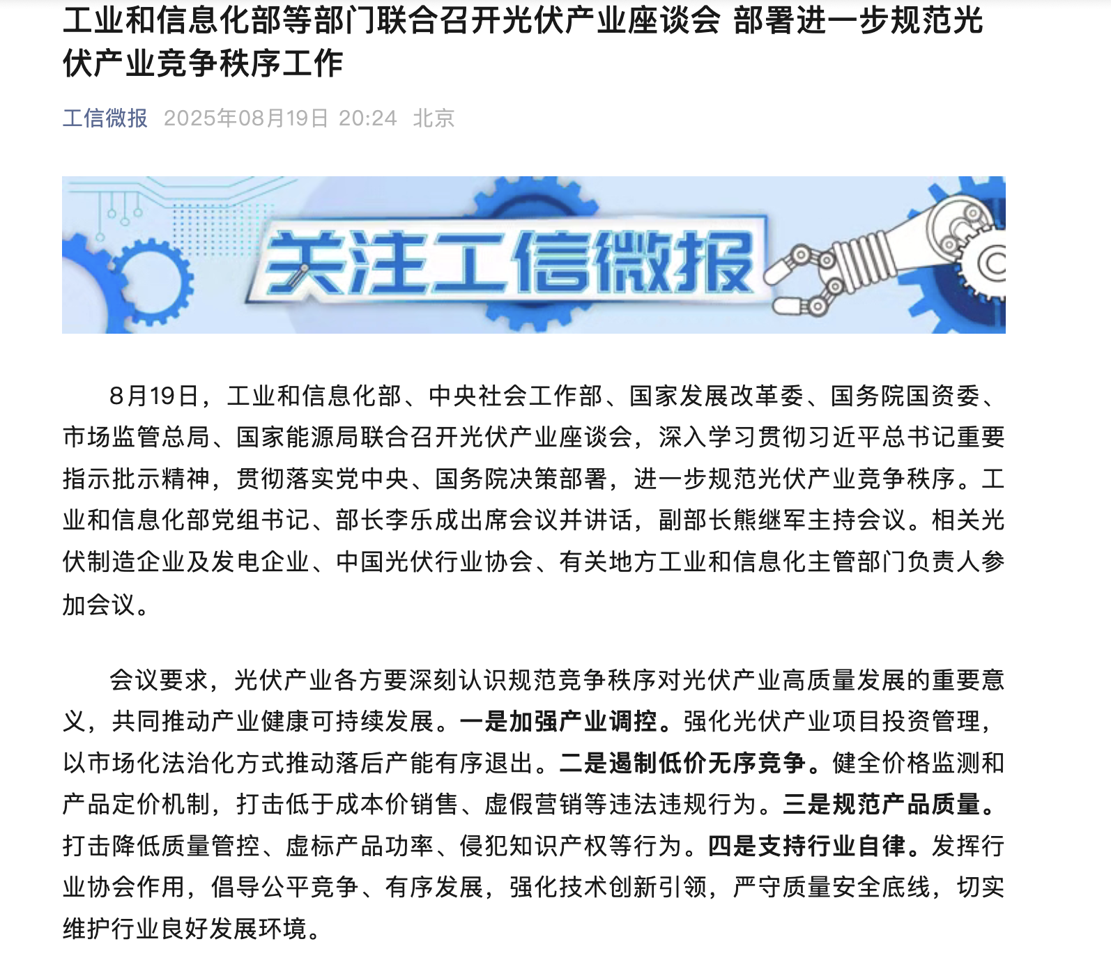 8月19日晚,工信部官微“工信微报”发文称,当日,工业和信息化部、中央社会工作部、国家发展改革委、国务院国资委、市场监管总局、国家能源局联合召开光伏产业座谈会,进一步规范光伏产业竞争秩序。