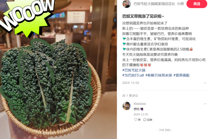 这些火锅店大多强调皱叶甘蓝的营养价值。小红书平台上,多位巴奴店长就曾发布笔记推介门店的皱皮菜,强调皱皮菜的健康养生属性,强化消费者的认知。