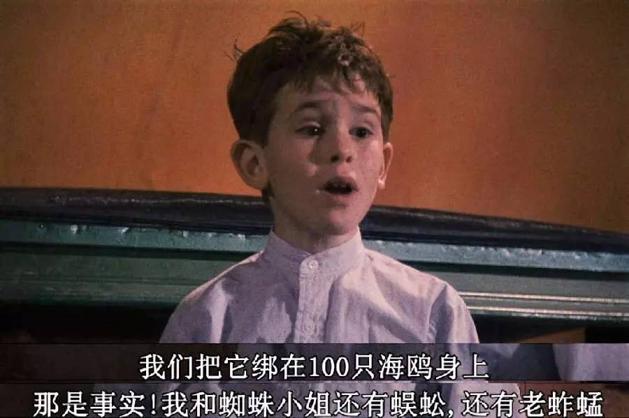 当他来到纽约,影片的样式从动画转换回电影,面对疑惑的众人时,他解释道“我们把它(巨桃)绑在100只海鸥身上”,众人哄笑。有那么一瞬间,也许你会突然惊觉是否小詹姆斯的整个历险其实只是他的一个梦?