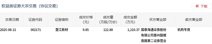 8月21日,楚江新材大宗交易成交122.88万股,成交额1210.37万元,占当日总成交额的2.41%,成交价9.85元,较市场收盘价9.85元持平。