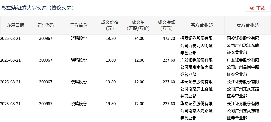 8月21日,晓鸣股份大宗交易成交60万股,成交额1188万元,占当日总成交额的2.79%,成交价19.8元,较市场收盘价22.44元折价11.76%。