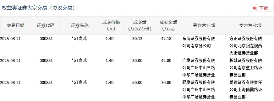 *ST高鸿今日大宗交易平价成交110.13万股,成交额154.18万元