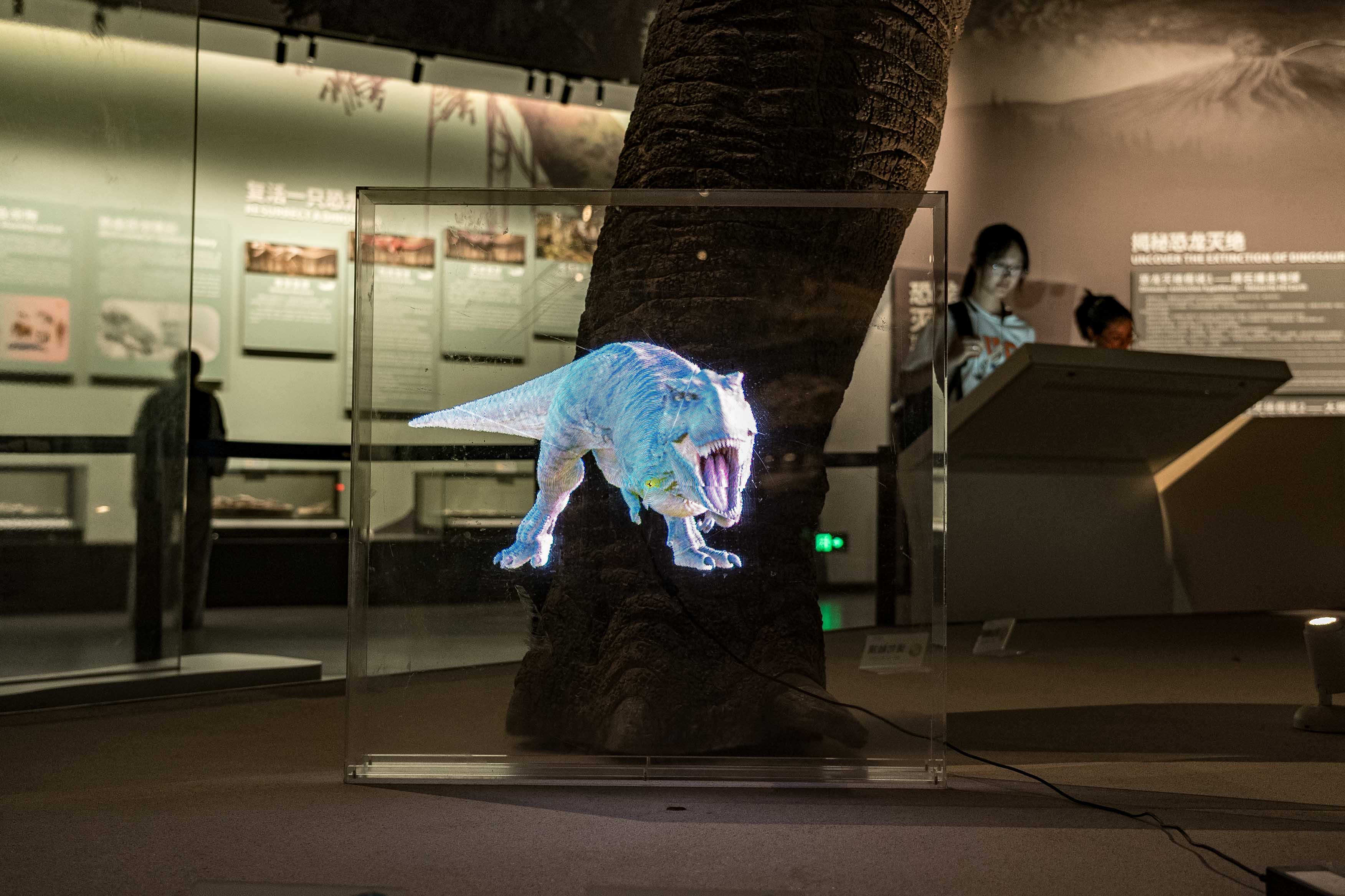 同时,馆内成都星蓝星数字科技有限公司带来的全息智能炫屏裸眼3D展示设备,利用人类视觉暂留技术原理,通过超高密度LED灯带旋转成像,呈现出逼真的裸眼3D立体效果,为成都自然博物馆的展览增添了科技感和趣味性。