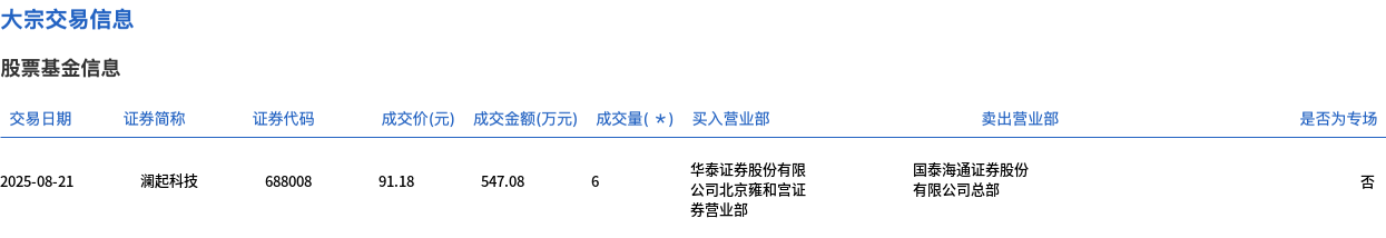 澜起科技今日大宗交易平价成交6万股,成交额547.08万元