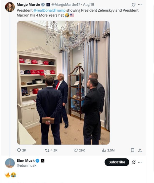 8月以来,马斯克在社交媒体多次发文,支持特朗普宣布向华盛顿特区部署国民警卫队。本周二,马斯克用火焰和笑脸符号回复了白宫通讯顾问玛戈·马丁的贴文。马丁在贴文中放出乌克兰总统弗拉基米尔·泽连斯基和法国总统埃马纽埃尔·马克龙在白宫参观的照片,介绍当时特朗普正在向两人展示“特朗普再战4年”的帽子。
