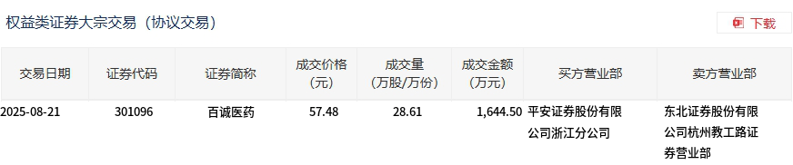百诚医药今日大宗交易平价成交28.61万股,成交额1644.5万元