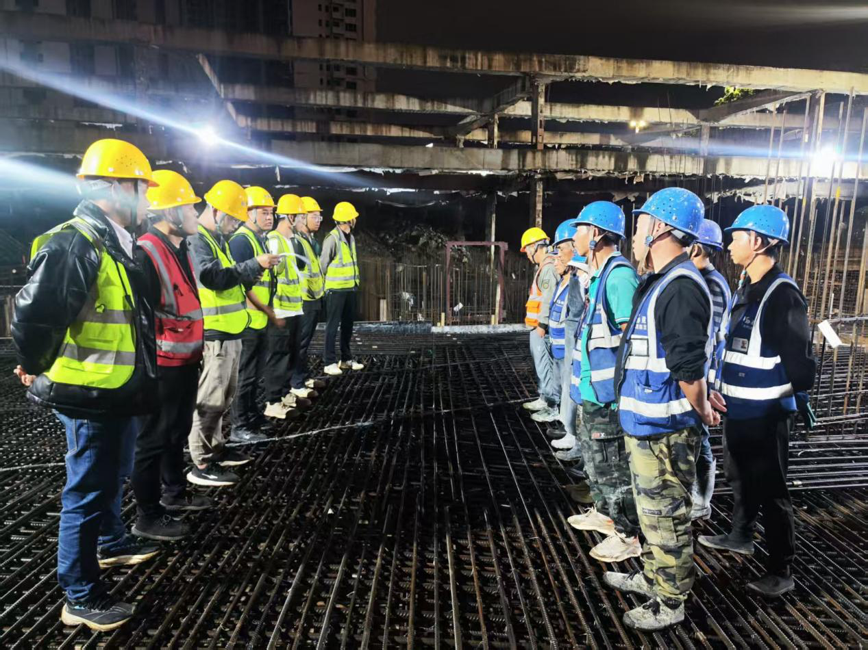 为确保浇筑质量与进度,良黎地产联合施工团队超前策划,制定详尽的筏板浇筑专项方案,成立混凝土保障组、技术保障组、安全应急组等9个专项小组,设置多重防护体系,有效保障了毗邻地铁、河流等周边环境的安全;建立"指挥-调度-执行"三级联动机制,联合混凝土供应商、运输单位及监理单位实现高效协同。针对城市早高峰,项目设置5个关键路口疏导岗,运输罐车循环调度,实行"即到即卸"模式;规划临时停车区保障供应连续性。提前储备应急物资,协调30名工人轮班作业,并设置休息区保障人员安全。