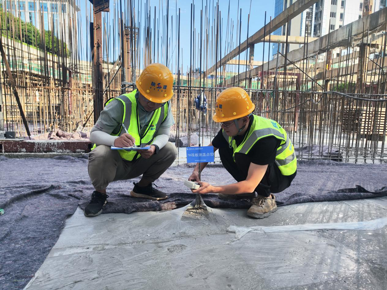 面对超高层大体积混凝土浇筑的技术挑战,项目团队通过材料优化、智能监测与精细化施工确保工程质量。采用低水化热水泥与高性能外加剂优化配比,减少水化热影响;部署智能温控系统实时监测混凝土内外温差,确保温度梯度处于安全阈值;创新采用“塑料薄膜+棉毡覆盖+表面蓄水”复合养护工艺,结合自动测温装置动态调整养护措施,将温差严格控制在25℃以内,有效预防裂缝产生。施工过程中,团队实施24小时轮班监测,严控混凝土坍落度与入模温度,并采用分层浇筑+二次振捣工艺,确保结构密实度。运用BIM技术模拟浇筑流程,调配3台泵车及30台罐车,实行分区推进、分层浇筑。
