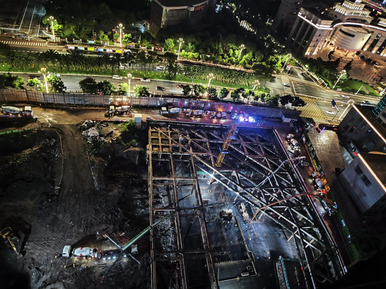针对16.4米超深基坑的复杂工况,项目采用“支护桩+钢筋混凝土”内支撑复合体系,并联合中国有色金属工业昆明勘察设计研究院、北京城建勘测设计研究院等权威机构组建技术攻关组,制定专项施工方案。通过“动态监测+智能预警”系统,对基坑沉降、位移等关键指标实施毫米级精度跟踪,成功克服内支撑体系下的空间限制,确保大体积混凝土顺利浇筑。这一系列技术创新不仅保障了施工安全,更以“智慧建造+科技赋能”模式,为后续超高层施工积累了宝贵经验,彰显了项目团队在极端工况下的技术与攻坚能力。
