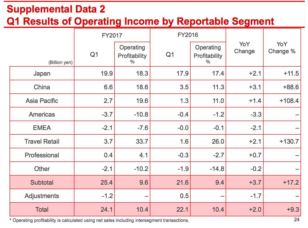 一季度,资生堂旅游渠道的收入大涨81%到110亿日元,CPB的零售业务翻了三番、NARS和ANESSA翻了一倍多、SHISEIDO增幅达到40%。中国市场上,上述品牌的增幅也都达到了70%,零售渠道营业利润率33.7%亦创新高。