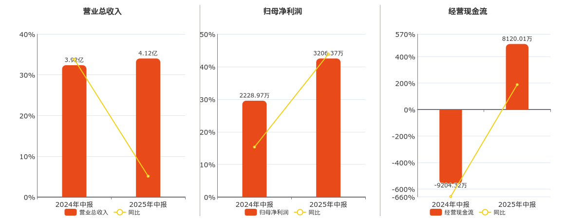 公司营业总收入为4.12亿元,较去年同报告期营业总收入增加1993.19万元,实现2年连续上涨,同比较去年同期上涨5.09%。归母净利润为3206.37万元,较去年同报告期归母净利润增加977.40万元,实现2年连续上涨,同比较去年同期上涨43.85%。经营活动现金净流入为8120.01万元,较去年同报告期经营活动现金净流入增加1.73亿元。