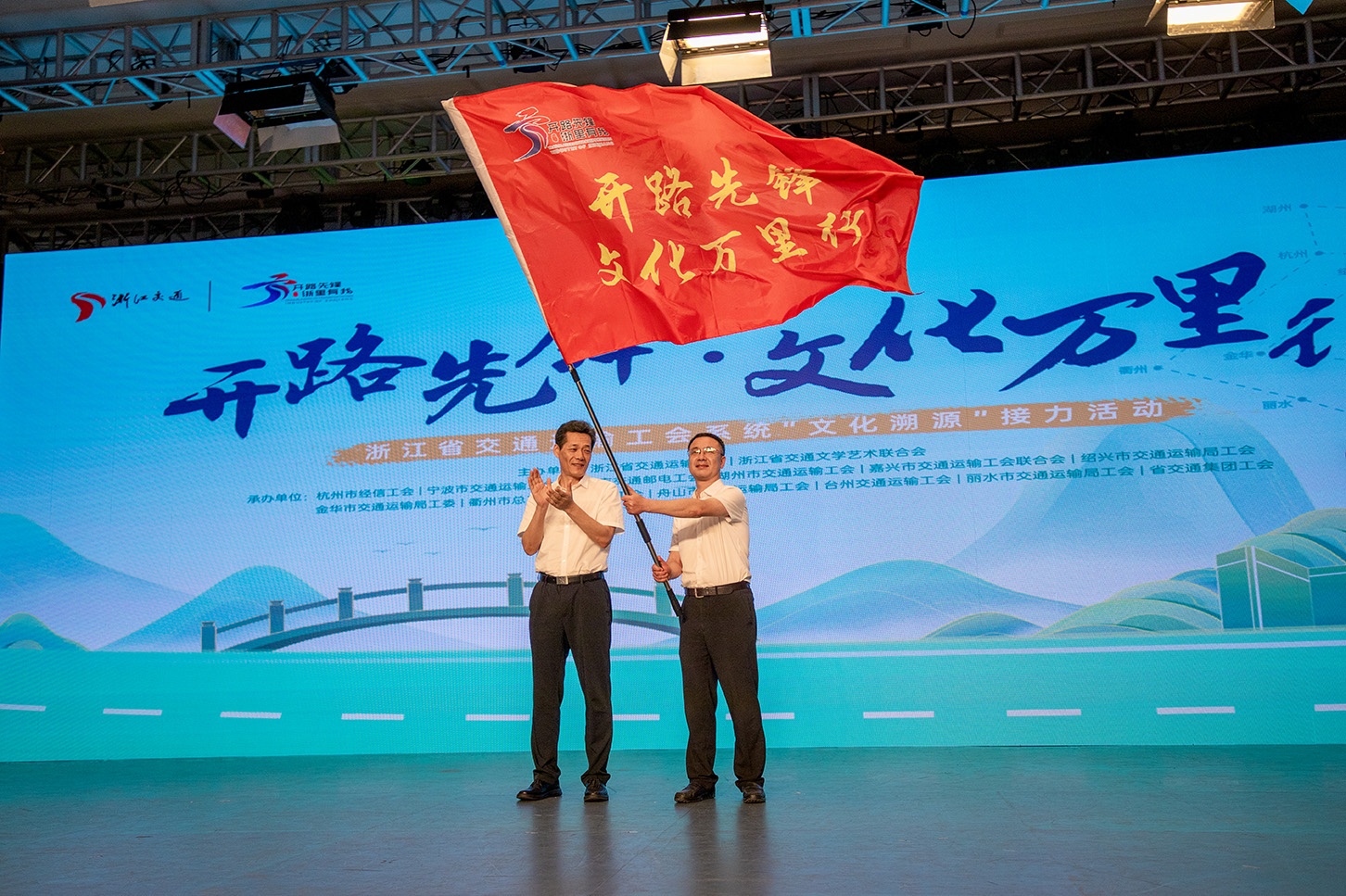 48小时的文化溯源,在精神火炬传递中迎来高潮。“开路先锋·文化万里行”接力交接仪式上,甬剧《宝顺轮・远航》、评话《我在灯就在》、情景剧《闪耀芳华》、舞蹈《奔甬之路》接连上演,以艺术语言再现浙江交通波澜壮阔的奋斗史诗。当“桥吊状元”竺士杰、“盾构先锋”黄毅、“公交暖心使者”陈霞娜三位全国劳模共同登台,全场响起热烈的掌声。