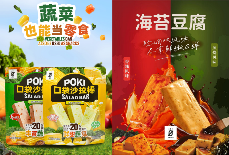 在此次上新的产品中,星期零口袋沙拉棒和海苔豆腐升级回归。其中口袋沙拉棒延续炙烤多蔬与海苔芝士两种经典风味,兼顾高蛋白与多种蔬菜营养,并经过多次克重测试,定为每根30克,既可轻松放入口袋,也能满足解馋、代餐等多种需求,适合上学、通勤、户外等日常场景。海苔豆腐则以大米、大豆、豌豆、鹰嘴豆和小麦五种植物蛋白为基础,蛋白质含量大于12克/100克,5块海苔豆腐的蛋白质含量相当于4杯牛奶,而单块热量仅为1/4块黑巧克力,同时仍采用0添加山梨酸钾的配方,经过18小时低温发酵,呈现多汁Q弹的口感,并提供香辣与照烧两种风味,满足不同口味偏好。