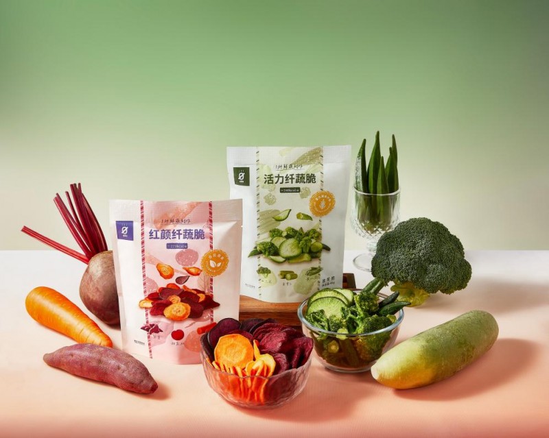活力纤蔬脆选用西兰花、黄秋葵、青萝卜三种优质蔬菜,口感轻脆、清爽可口;红颜纤蔬脆则融合甜菜根、紫薯、胡萝卜,呈现丰富的天然色彩与甘甜滋味。两款产品均富含膳食纤维,每袋膳食纤维含量约等于100-120g羽衣甘蓝的膳食纤维含量,且热量不超过240kcal/袋,可作为午后小食或外出便携零食。