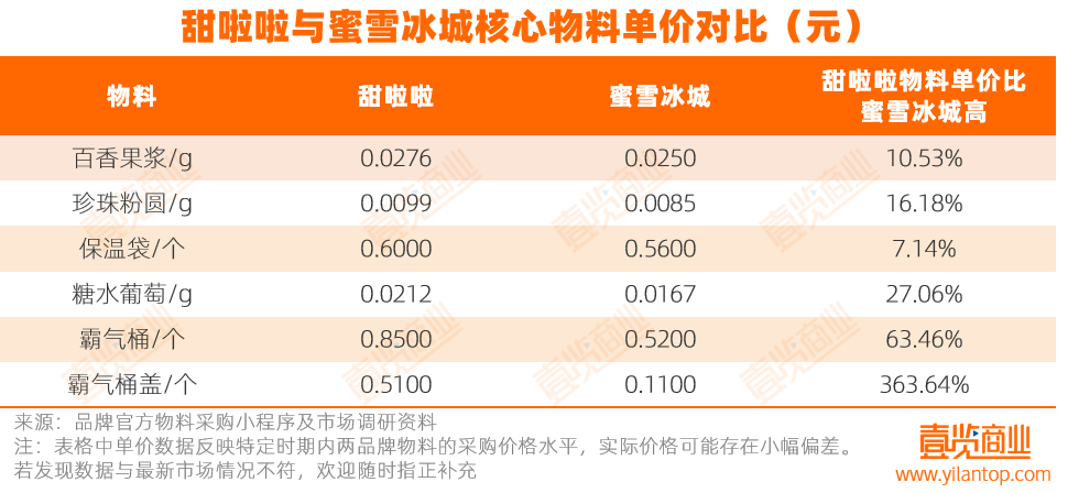 这直接导致其物料成本高企,并将持续性的成本劣势固化在商业模式中。壹览商业获取的加盟商物料价格对比显示,甜啦啦关键原料及包材价格普遍高于蜜雪冰城,部分包材价差甚至高达数倍。