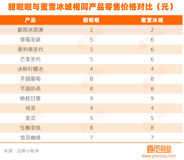 成本高企的同时,甜啦啦的产品售价却未形成优势。对比显示,甜啦啦有12款产品与蜜雪冰城同质同价,甚至部分产品售价更低:草莓圣代、奥利奥圣代、芒果圣代售价5元,较蜜雪冰城低1元。