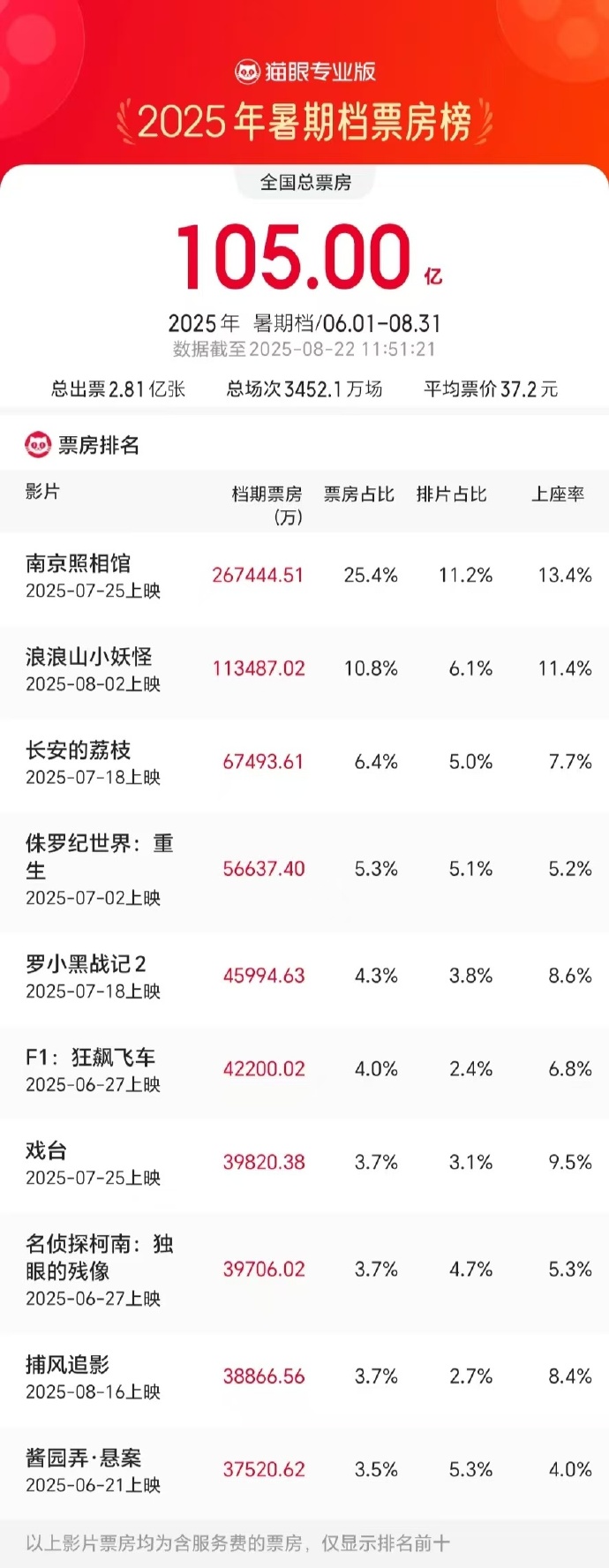 据猫眼专业版数据,截至8月22日11时51分,2025年暑期档总票房(含预售)破105亿,《南京照相馆》《浪浪山小妖怪》《长安的荔枝》分列暑期档票房榜前三位。