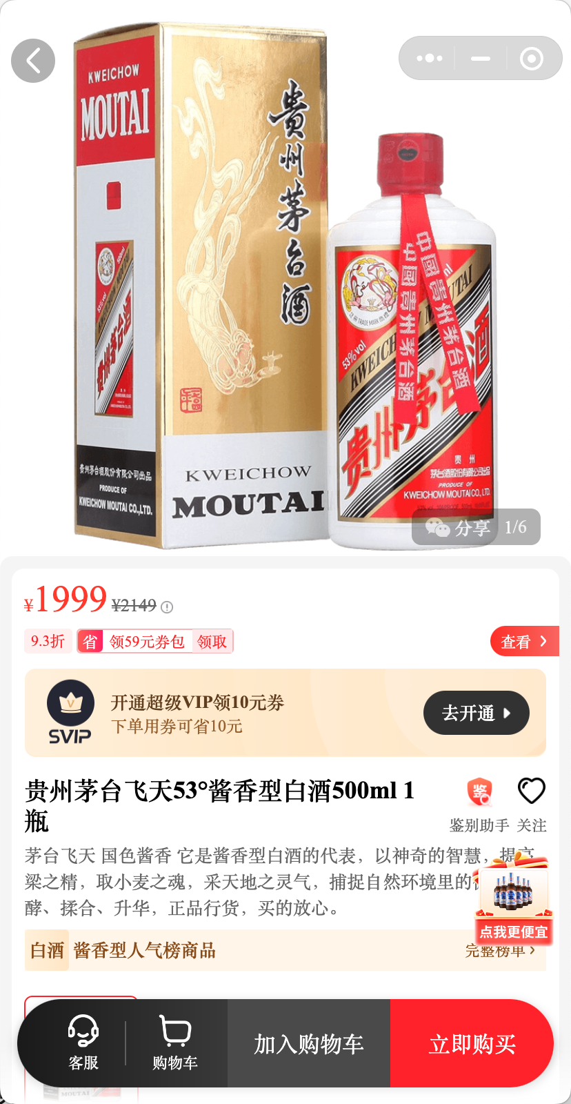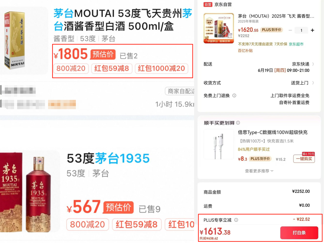 618期间,淘宝闪购上的飞天茅台53度500ml预估到手价格为1805元,京东超市白酒自营专区,有消费者领取“满999元减329元”的白酒专用优惠券后,飞天茅台单瓶装直接显示约1620元,PLUS会员到手约1613元(均非出口版)。