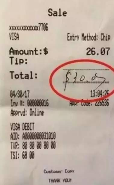 之前有华人在某论坛爆料,今年1月初带着从国内刚到美国的父母去旧金山某头牌中餐馆吃饭,因为这家餐馆只接受现金支付,所以店家递过来一张手写的账单也没在意,就顺手把银行卡递了过去。