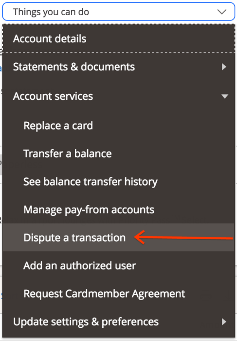 以Chase为例,右边Things you can do里面选择Dispute a Transaction,会跳到页面来让你选取想要申诉的交易。