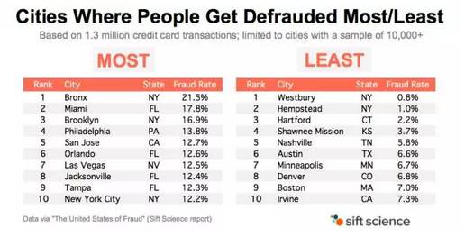 旧金山一家专门为Aribnb等公司提供在线交易反欺诈服务的公司SiftScience做了一件事情。他们分析了全美在6000多个交易点进行的130万笔银行卡交易,并最终得出了一份全美信用卡盗刷报告。
