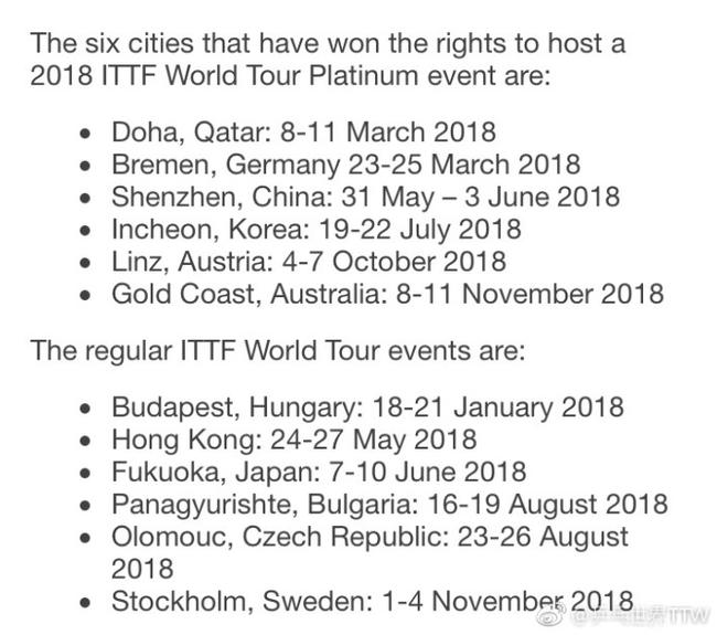 2018国际乒联世界巡回赛日程公布:中国公开赛落户深圳